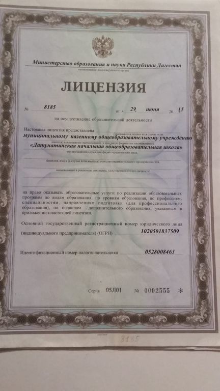 Полное наименование образовательной организации* Муниципальное казенное общеобразовательное учреждение"Датунатинская НОШ"