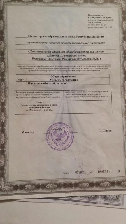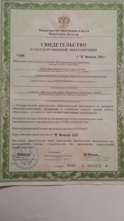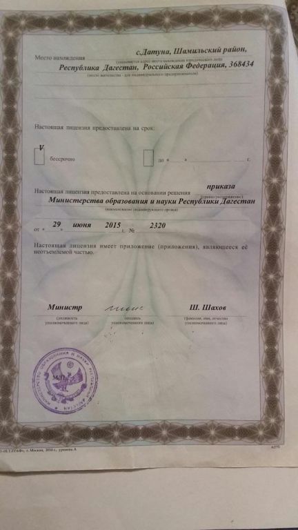 Адрес местонахождения образовательной организации* 368430, РД, Шамильский район, с.Датуна